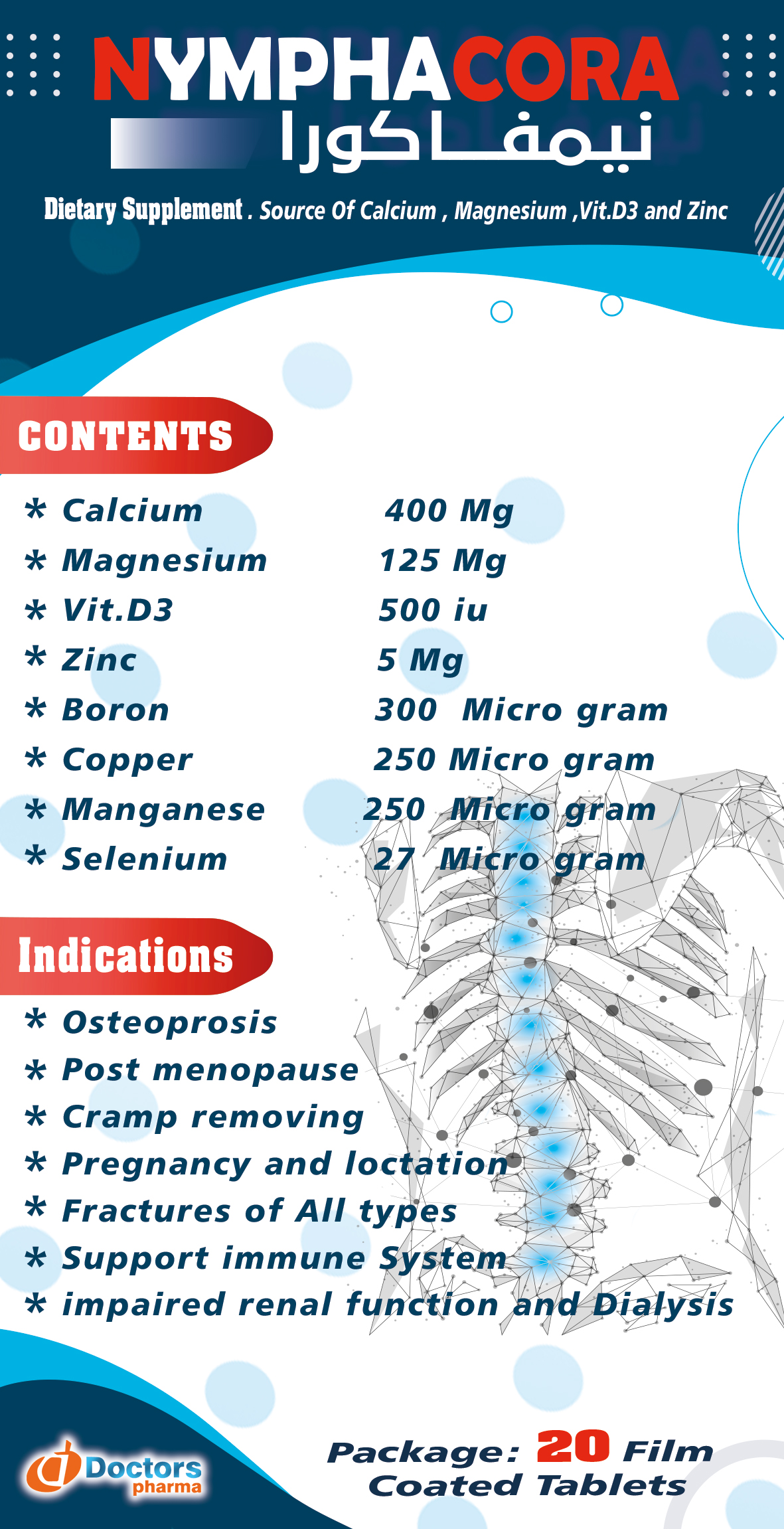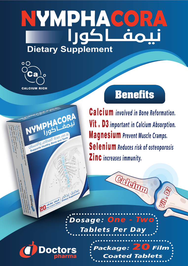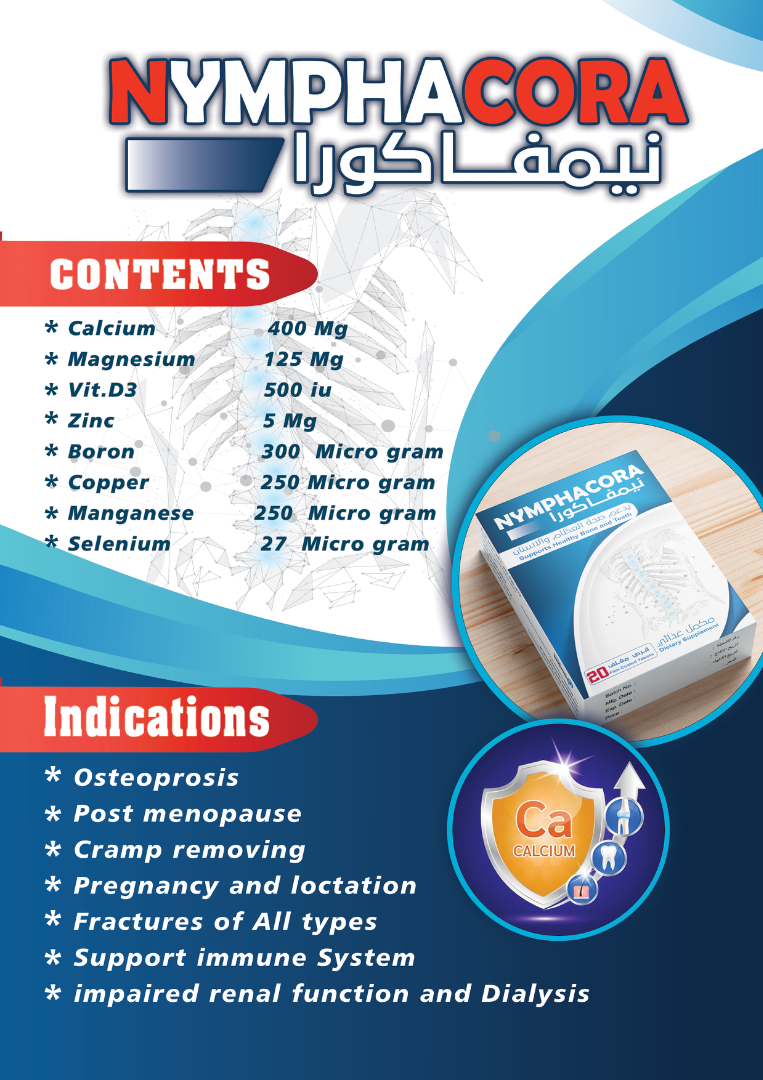 نيمفاكورا مكمل غذائي مصدر للكالسيوم و الماغنسيوم و فيتامين د٣ و الزنك مع وجود البورون ،الكابر،المنجنيز ، السيلانيم
