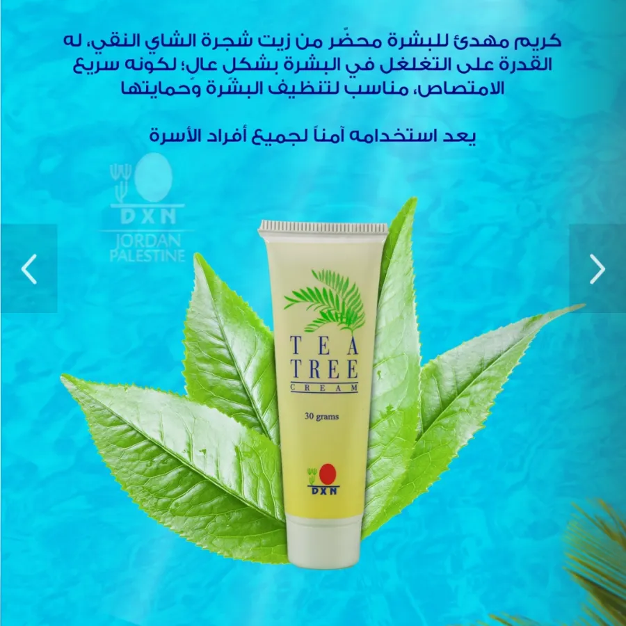 هو كريم مهدئ للبشرة تم تركيبه خصيصًا بزيت شجرة الشاي. يتميز هذا المنتج بتغلغل عالي للبشرة وامتصاص سريع وسلس للبشرة كريم شجرة الشاي، منتج طبيعي، يتكون بشكل أساسي من زيت شجرة الشاي الصافي، المستخلص من أوراق شجرة الشاي وهو عبارة عن مضاد حيوي، ومطهر طبيعي، يحتوي على خصائص مضادة للميكروبات والفطريات، وقدرة عالية، وسريعة على التغلغل داخل طبقات الجسم، ومحاربة ومكافحة العديد من الأمراض الجلدية، وتوفير الحماية الضروريّة لصحّة البشرة، ويعتبر كريم شجرة الشاي، من الكريمات الآمنة، والمستخدمة على نطاق واسع حول العالم، والمناسبة لجميع الفئات العمريّة.