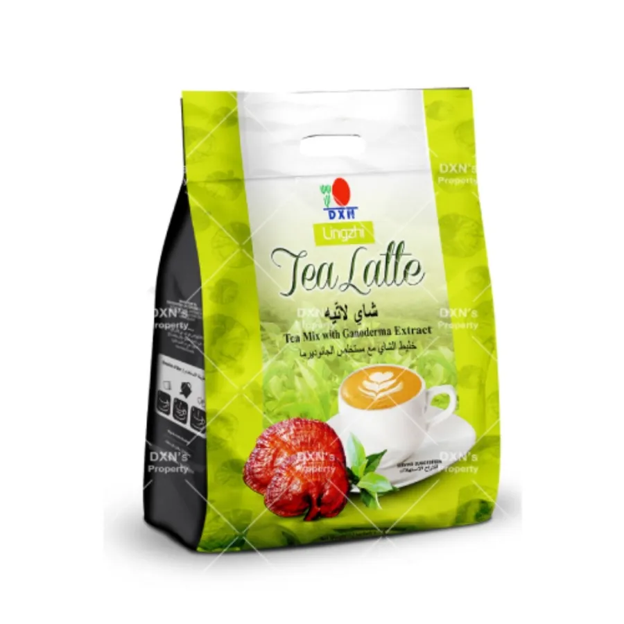 شاي لاتيه من dxn : هو عبارة عن مسحوق الشاي الفاخر مع مبيض كريمة ليس من مشتقات الألبان ومضاف له مستخلص فطر الجانوديرما المعروف بفوائده الكثيرة