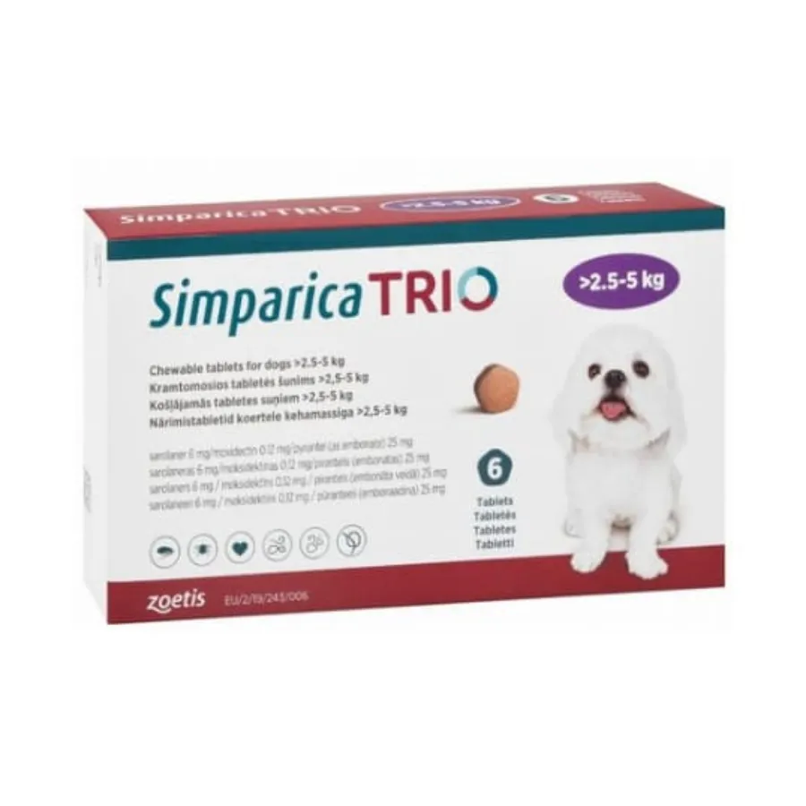 سيمباريكا تريو هو دواء على شكل أقراص قابلة للمضغ مخصص للكلاب، يوفر حماية شاملة ضد الطفيليات الداخلية والخارجية. يعمل على مكافحة البراغيث والقراد والديدان القلبية والديدان الأسطوانية والديدان الخطافية. يوفر قرص واحد شهريًا حماية فعالة ومريحة، حيث يبدأ في القضاء على البراغيث في غضون 4 ساعات والقراد المشلول في غضون 24 ساعة.